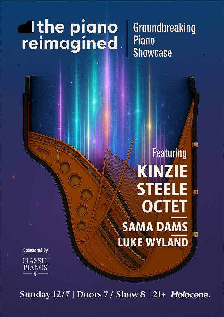 Kinzie Steele is a contemporary-impressionist collective from the Pacific Northwest. They craft instrumental compositions of beauty, healing, & space using piano, guitar, and two percussionists on drumsets and gongs. Inspired by the surreal impressions of Claude Debussy and the textured voicings of psychedelic rock, their compositions sail freely through genres and virtuosic expressions to expand the piano genre outside of its traditional classical and jazz settings. Originally a piano/drums duo of Seth Kinzie (Plum Sutra) and Andy Steele (Catskills), Kinzie Steele's debut record, “When I Was a Tree,” was released in 2018. When Siberian Russian Label Shum Derevyev Records re-released it on cassette in 2021, they declared, “Utmost Virtuosity with a grand piano and a drum kit… Meditations about the design and harmony of the Universe.” For the new quartet, Seth and Andy have been joined by Dan Galucki (Wooden Indian Burial Ground) on drums and Ben Walden (Taco Tapes) on electric guitar. Their sophomore album, recorded in Astoria, OR with a string quartet, was released in November, 2025.